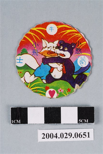 1.本物件為丁丁與平平翁仔標,為圓形花邊紙質卡牌,正面圖案右左兩邊分別為丁丁與平平,右上有紅字「丁丁」,左上有深紅字「平平」,由上右下左各圖案與字樣分別是「猜拳-布」、「撲克牌-方塊」、紅字「象棋-仕」、藍字「十二生肖-龍」;背面圖案為為小憨與小飛,右上有藍字「小憨」,左上有藍字「小飛」,由上右下左各圖案與字樣分別是藍字「十二生肖-牛」、「猜拳-剪刀」、「撲克牌-紅心」、藍字「象棋-士」。