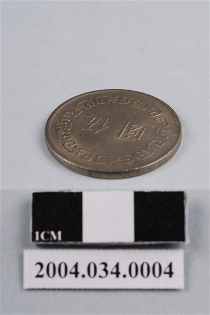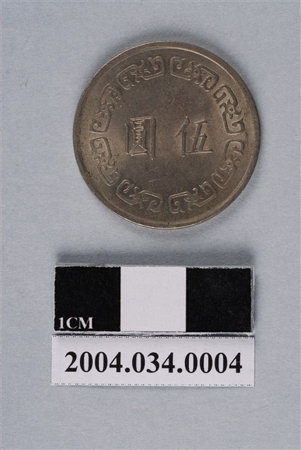 1.本物件為1972年製造的五元硬幣。呈鐵灰色,幣邊為全絲邊。貨幣正面為蔣中正朝向左側之頭像,頭像上方逆時針方向環鐫「中華民國六十一年」等8字。硬幣背面外側環鐫8個幾何圖形,中央左、右各鐫「伍」、「圓」兩字。2.本類貨幣最早於1970年10月31日發行,自發行年至1979年,每年均有製造版本,1981年12月8日停用。硬幣材質為75%銅、25%鎳。