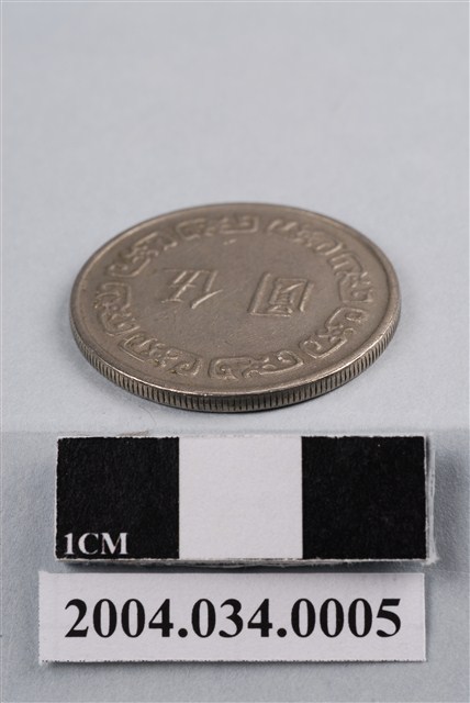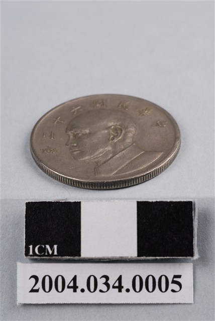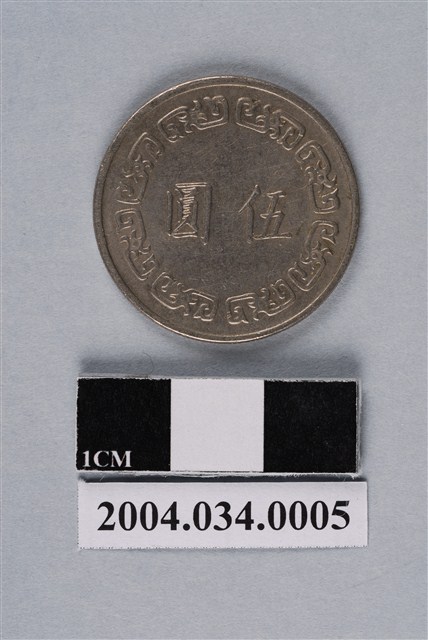 1.本物件為1973年製造的五元硬幣。硬幣呈鐵灰色,幣邊為全絲邊。硬幣正面為蔣中正朝向左側之頭像,頭像上方逆時針方向環鐫「中華民國六十二年」等8字。貨幣背面外側環鐫8個幾何圖形,中央左、右各鐫「伍」、「圓」兩字。2.本類貨幣材質為75%銅、25%鎳,最早於1970年10月31日發行,自發行年至1979年,每年均有製造版本,1981年12月8日停用。