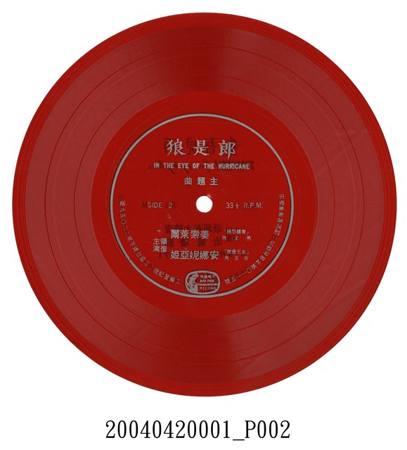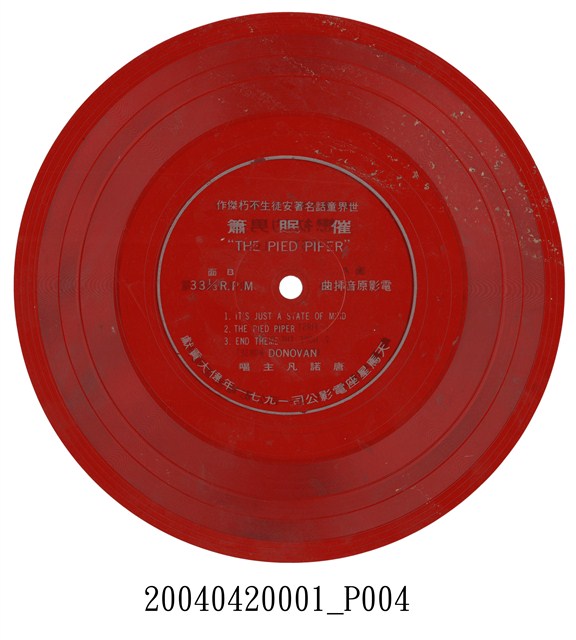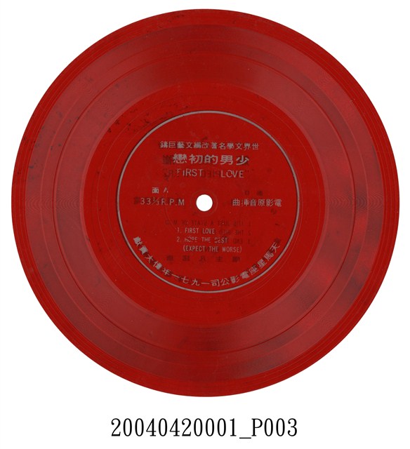 這類紅色軟式七吋小唱片通常是電影宣傳贈品,是看電影附贈的簡單唱片,音質不佳、保存不易,卻也格外低廉而輕便,有的電影便以這種唱片灌錄主題曲或電影內容的精彩片段,供觀眾紀念賞玩。這張唱片兩面錄製兩部電影的主題曲,均為1971年在臺上映的電影,第一面的電影名為”TWINKY”(女主角的名字),是一部義大利製作的愛情喜劇,電影穿插多首輕鬆愉快的歌曲,音樂獲得歐洲金唱片,男主角Charles Bronson(現常譯為「查爾斯布朗森」)也獲得金球獎最受歡迎男明星獎,他在70年代好萊塢片中專門扮演西部片中的硬漢,如『狂沙十萬里』等經典巨片,媒體稱之為「老查」。