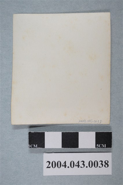 本物件為女子池邊獨照,為黑白照片,畫面中可見女子單手向身後支撐坐於池畔旁,其著淺色平口連身長洋裝,並有小披肩,腳踩高跟鞋,並未直視鏡頭。此照片攝於戶外空間,該池畔為弧形,有階梯式設計,後方可見房屋、樹木以及兩人站於池畔旁。