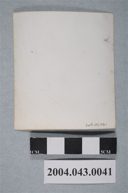本物件為女子於石椅上獨照,為黑白照片,畫面中可見女子坐於磨石子材質的椅子上,其頭上有寬版髮帶,身著淺色平口連身長洋裝、小披肩,腳踩高跟鞋,一旁還有一只深色小提包,其左手向身後支撐,右手則拿著一副墨鏡,像畫面右側看去,並未直視鏡頭。此照片攝於戶外空間,後方可見草地、樹木。