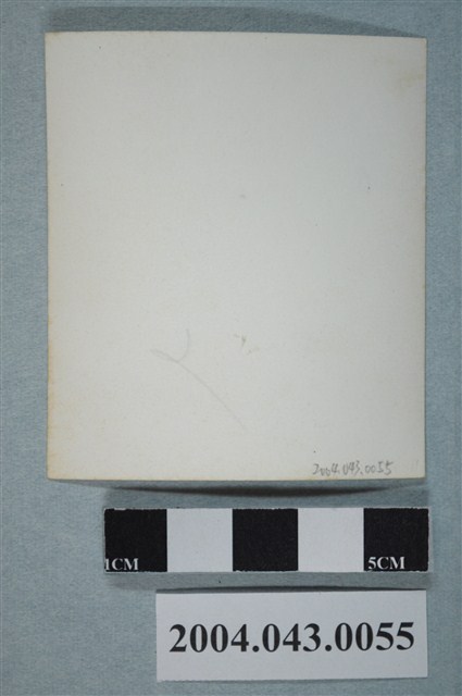本物件為男女於草地合照,為黑白照片,畫面中可見兩人坐在草地上,女子身著格紋連身長洋裝,手中持有皮包,男子則深著淺色襯衫、西裝褲,望向鏡頭,此照片攝於戶外空間,可見草地及後方樹木。