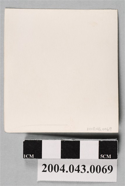 本物件為女子獨照,為黑白照片,畫面可見女子留有一頭捲短髮,左側嘴角邊有明顯痣,女子身著深淺相間的合身短袖上衣,下身為花紋長裙,女子右手撐於腰間,眼神望向畫面左側,此照片攝於戶外空間,後方可見樹木,左側有一名身著西裝的男子入鏡,右側可見房屋屋頂。