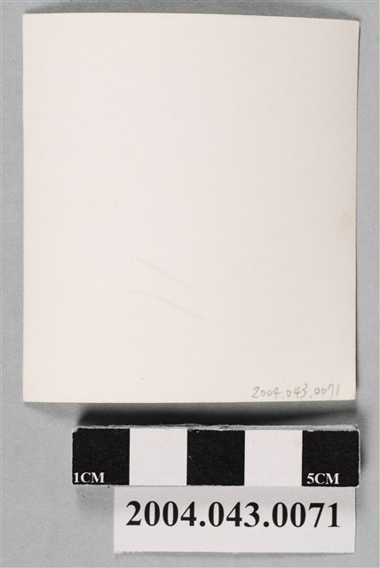 本物件為2名男子與1名女子合影之照片,物件本體為一張直式照片,圖像中左側為1名梳油頭,身穿麻製短袖搭配短褲,將衣袖捲至肩膀的男子,中間為1名梳油頭,身穿麻製短袖搭配長褲的男子,右側為1名捲短髮,身穿花邊大領的女子,3人在一間木板隔間的空間內,並肩而坐於椅子上合照。登錄號2004.043.0071-2004.043.0075為同樣3人。