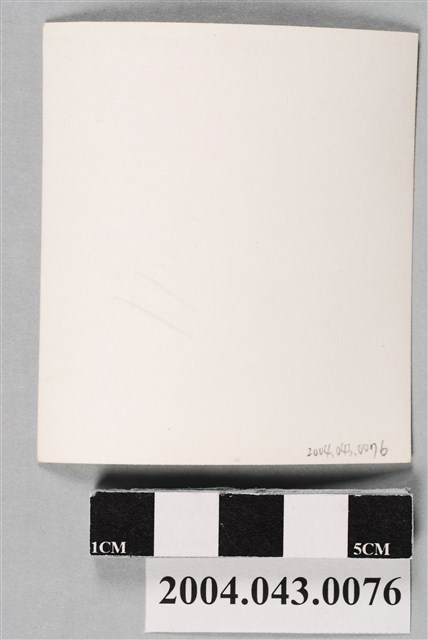 本物件為2名男子與1名女子合影之照片,物件本體為一張直式照片,圖像中左側為1名梳油頭,身穿麻製短袖搭配短褲,將衣袖捲至肩膀的男子,中間為1名梳油頭,身穿麻製短袖搭配長褲的男子,右側為1名捲短髮,身穿花邊大領的女子,3人在一間木板隔間的空間內,並肩而坐於椅子上合照。本物件與登錄號2004.043.0075照片中3人相同。