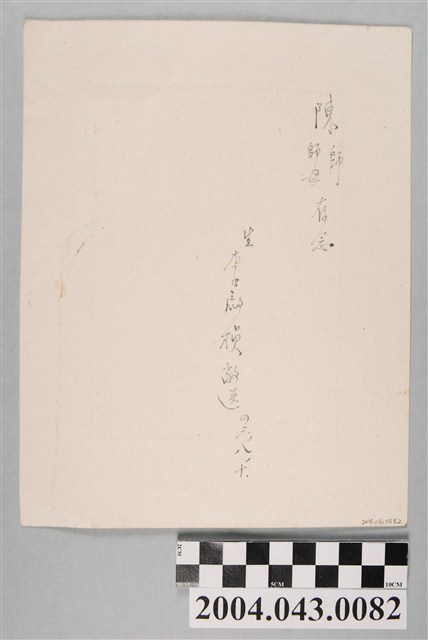 1.本物件為臺北市世界照相館拍攝結婚,相片畫面中新郎左胸別著胸花左手拿著手套站在新娘的左手邊,新娘則手拿著花束,佩戴項鍊及頭紗,背面有「陳師及師母存念,生李啟損敬送,の三八十」字樣。