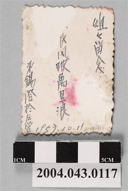 本物件為弟錫澄大頭照,戴著帽子,身穿襯衫,繫著領帶,下方寫有「每天studio」等文字,右下方則有人騎在駱駝身上的圖案,背面寫著「□長風破萬里浪 姐姐留念 弟錫澄於左營」以及「1957.10.11」等資訊。