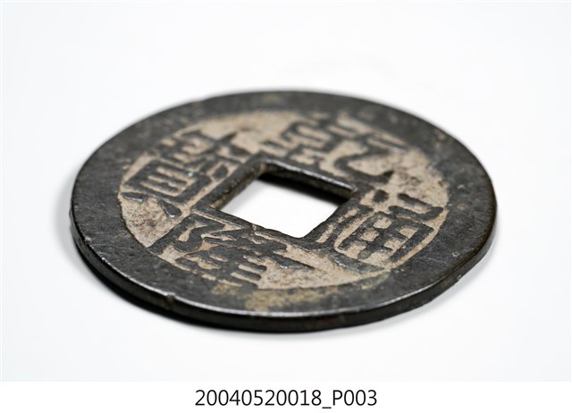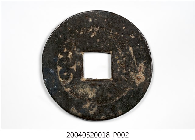 1.本物件為清乾隆年間製造的乾隆通寶制錢。錢幣呈圓形,直徑約2.5公分,中間有一方孔,主要材質為銅。錢幣表面由同心雙圓所構成,外圓呈黑褐色,無圖案,內圈底色為黃銅色。錢幣正面內圈分別在方孔上、下、右、左依次以楷書鎸上「乾隆通寶」等4字,字的顏色與外圓同色;錢幣反面方孔左、右兩側則以鎸上滿文的寶、泉兩字,以示製造機構。2.清高宗乾隆皇帝即位後,即開始鑄造「乾隆通寶」。乾隆朝連同中央的寶泉局、寶源局及地方在內,共有29處鑄錢機構。本物件是由寶泉局所鑄造,寶泉局始設於明太祖洪武年間,清代延續明代寶泉局鑄幣規制,隸屬於戶部,並且各設東作廠、西作廠、南作廠、北作廠,鑄造的錢幣主要供官民流通使用。1910年(清宣統2年),寶泉局裁撤。