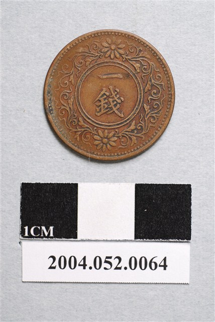 1.本物件為1920年鑄造面額一錢的日本錢幣,直徑長約2.3公分。硬幣以青銅為主要材質,呈黃銅色,幣邊為全絲邊。硬幣正面中央鐫桐樹圖案,圖案兩側各鐫1朵櫻花圖案,桐樹圖案下方順時針方向環鐫「大正九年」等4字,上方逆時針方向環鐫「大日本」3字,最外側環鐫點狀幾何圖形;貨幣背面最外側亦環鐫點狀幾何圖形,中央為雙環同心圓,圓中心由上而下書寫「一錢」字樣,外側環鐫幾何圖形,正上、正下各鐫1個菊花圖案。2.本物件是日本戰前大正及昭和初年所發行的桐一錢青銅幣,1938年(昭和13年)為此類貨幣最後一批發行的年份。