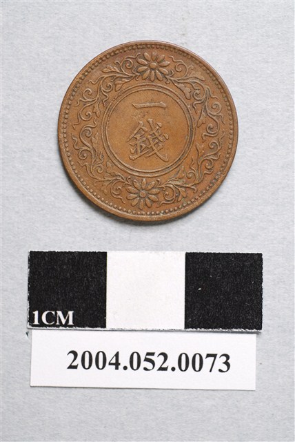 1.本物件為1922年鑄造面額一錢的日本錢幣,直徑長約2.3公分。硬幣以青銅為主要材質,呈黃銅色,幣邊為全絲邊。硬幣正面中央鐫桐樹圖案,圖案兩側各鐫1朵櫻花圖案,桐樹圖案下方順時針方向環鐫「大正十一年」等5字,上方逆時針方向環鐫「大日本」3字,最外側環鐫點狀幾何圖形;貨幣背面最外側亦環鐫點狀幾何圖形,中央為雙環同心圓,圓中心由上而下書寫「一錢」字樣,外側環鐫幾何圖形,正上、正下各鐫1個菊花圖案。