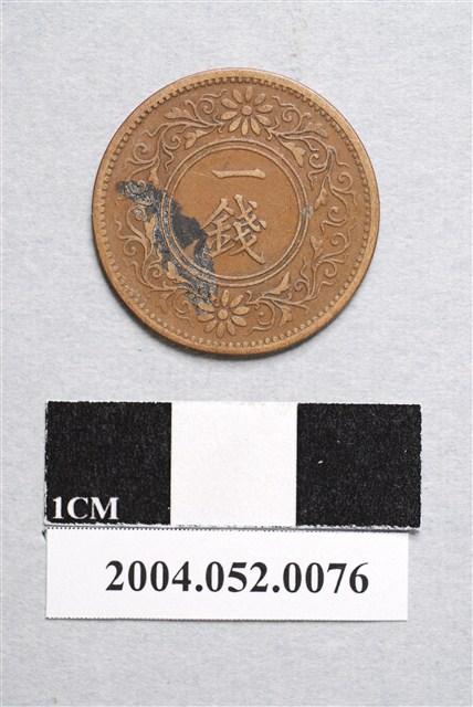 1.本物件為1923年鑄造面額一錢的日本錢幣,直徑長約2.3公分。硬幣以青銅為主要材質,呈黃銅色,幣邊為全絲邊。硬幣正面中央鐫桐樹圖案,圖案兩側各鐫1朵櫻花圖案,桐樹圖案下方順時針方向環鐫「大正十二年」等5字,上方逆時針方向環鐫「大日本」3字,最外側環鐫點狀幾何圖形;貨幣背面最外側亦環鐫點狀幾何圖形,中央為雙環同心圓,圓中心由上而下書寫「一錢」字樣,外側環鐫幾何圖形,正上、正下各鐫1個菊花圖案。