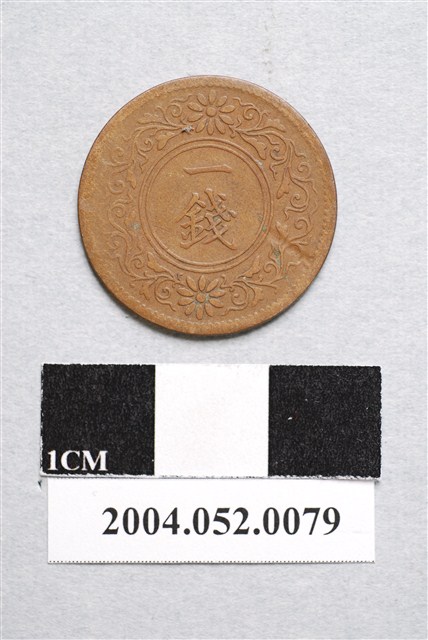 1.本物件為1924年鑄造面額一錢的日本錢幣,直徑長約2.3公分。硬幣以青銅為主要材質,呈黃銅色,幣邊為全絲邊。硬幣正面中央鐫桐樹圖案,圖案兩側各鐫1朵櫻花圖案,桐樹圖案下方順時針方向環鐫「大正十三年」等5字,上方逆時針方向環鐫「大日本」3字,最外側環鐫點狀幾何圖形;貨幣背面最外側亦環鐫點狀幾何圖形,中央為雙環同心圓,圓中心由上而下書寫「一錢」字樣,外側環鐫幾何圖形,正上、正下各鐫1個菊花圖案。2.本物件是日本戰前大正及昭和初年所發行的桐一錢青銅幣,1938年(昭和13年)為此類貨幣最後一批發行的年份。