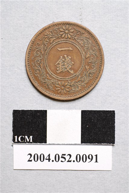 1.本物件為1933年鑄造面額一錢的日本錢幣,直徑長約2.3公分。硬幣以青銅為主要材質,呈黃銅色,幣邊為全絲邊。硬幣正面中央鐫桐樹圖案,圖案兩側各鐫1朵櫻花圖案,桐樹圖案下方順時針方向環鐫「昭和八年」等4字,上方逆時針方向環鐫「大日本」3字,最外側環鐫點狀幾何圖形;貨幣背面最外側亦環鐫點狀幾何圖形,中央為雙環同心圓,圓中心由上而下書寫「一錢」字樣,外側環鐫幾何圖形,正上、正下各鐫1個菊花圖案。2.本物件是日本戰前大正及昭和初年所發行的桐一錢青銅幣,1938年(昭和13年)為此類貨幣最後一批發行的年份。