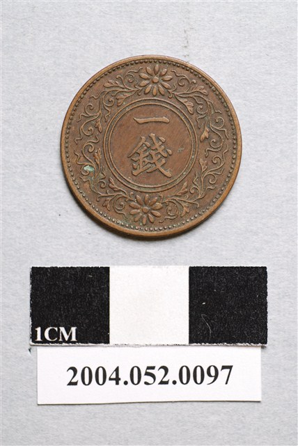 1.本物件為1934年鑄造面額一錢的日本錢幣,直徑長約2.3公分。硬幣以青銅為主要材質,呈黃銅色,幣邊為全絲邊。硬幣正面中央鐫桐樹圖案,圖案兩側各鐫1朵櫻花圖案,桐樹圖案下方順時針方向環鐫「昭和九年」等4字,上方逆時針方向環鐫「大日本」3字,最外側環鐫點狀幾何圖形;貨幣背面最外側亦環鐫點狀幾何圖形,中央為雙環同心圓,圓中心由上而下書寫「一錢」字樣,外側環鐫幾何圖形,正上、正下各鐫1個菊花圖案。2.本物件是日本戰前大正及昭和初年所發行的桐一錢青銅幣,1938年(昭和13年)為此類貨幣最後一批發行的年份。