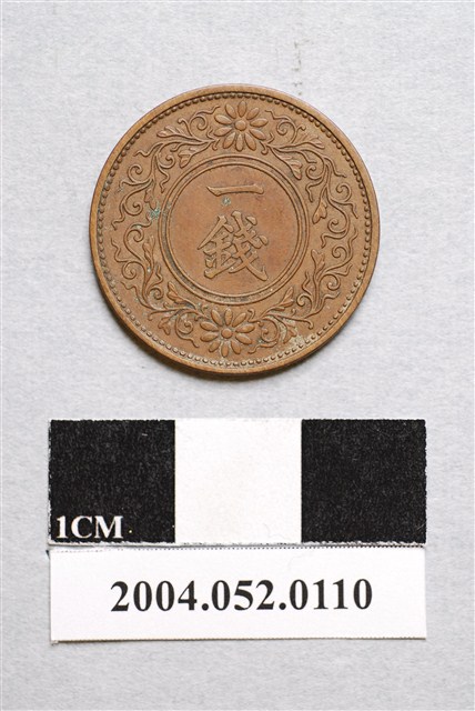 1.本物件為1938年鑄造面額一錢的日本錢幣,直徑長約2.3公分。硬幣以青銅為主要材質,呈黃銅色,幣邊為全絲邊。硬幣正面中央鐫桐樹圖案,圖案兩側各鐫1朵櫻花圖案,桐樹圖案下方順時針方向環鐫「昭和十三年」等5字,上方逆時針方向環鐫「大日本」3字,最外側環鐫點狀幾何圖形;貨幣背面最外側亦環鐫點狀幾何圖形,中央為雙環同心圓,圓中心由上而下書寫「一錢」字樣,外側環鐫幾何圖形,正上、正下各鐫1個菊花圖案。