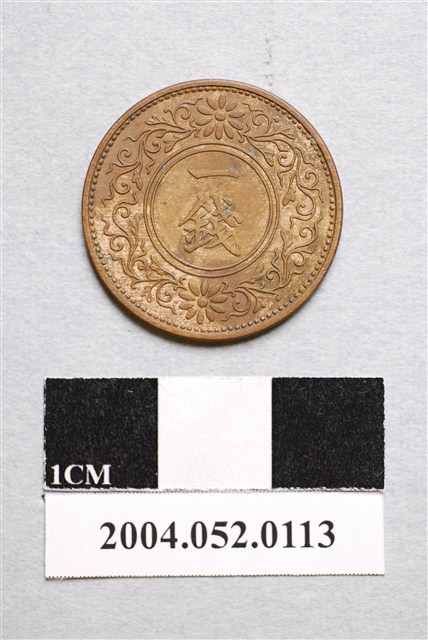 1.本物件為1938年鑄造面額一錢的日本錢幣,直徑長約2.3公分。硬幣以青銅為主要材質,呈黃銅色,幣邊為全絲邊。硬幣正面中央鐫桐樹圖案,圖案兩側各鐫1朵櫻花圖案,桐樹圖案下方順時針方向環鐫「昭和十三年」等5字,上方逆時針方向環鐫「大日本」3字,最外側環鐫點狀幾何圖形;貨幣背面最外側亦環鐫點狀幾何圖形,中央為雙環同心圓,圓中心由上而下書寫「一錢」字樣,外側環鐫幾何圖形,正上、正下各鐫1個菊花圖案。