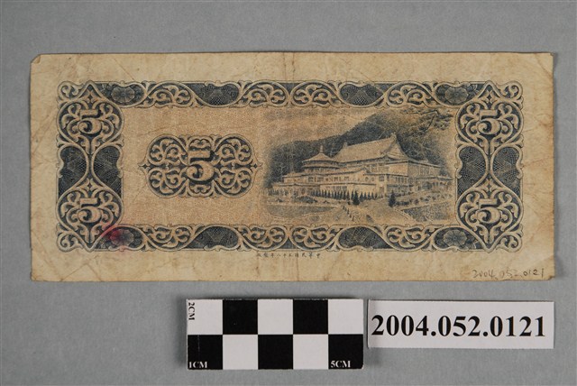 本物件為1969年臺灣銀行委託中央印製廠印製的新臺幣伍圓鈔券。以墨綠為主墨色,採橫式印製,正背兩面皆凹版。鈔票正面由幾何花紋構成鈔票圖案的方框,方框四個角落各正寫「伍」字。方框內部上側左、右兩邊各印有編號T979163U紅字,中間由右至左書寫「中華民國」等4字。方框內中間右側留白。中間左側繪製孫文肖像。正中央繪製略呈六邊形框的墨綠色幾何底圖,底圖中央由上而下書寫「伍圓」二字,底圖左右兩側交疊各一個略呈90度三角形的紅色幾何底圖。下方中央由右至左書寫「臺灣銀行」等4字。方框內下方右側為臺灣銀行董事長戳章,左側為臺灣銀行總經理戳章。方框邊界外下方中央由右而左書寫「中央印製廠」等5字。背面印製波浪型幾何花紋方框,方框四角各正寫1個「5」數字,方框內右側繪製中山樓圖案,左側以墨綠色長方形幾何花紋為底圖,底圖上覆寫「5」數字,方框外中央下方由右而左書寫「中華民國五十八年製版」等10字。