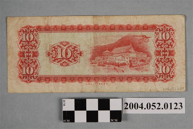 本物件為1969年臺灣銀行委託中央印製廠印製的新臺幣拾圓鈔券。以紅色為主墨色,採橫式印製,正背兩面皆凹版。鈔票正面由幾何花紋構成鈔票圖案的方框,方框四個角落各正寫「拾」字。方框內部上側左、右兩邊各印有編號T160858H紅字,中間由右至左書寫「中華民國」等4字。正中央繪製略呈橢圓形狀的紅色幾何花框底圖,底圖中央由上而下覆寫「拾圓」二字,中央幾何花框兩側各繪製1個略呈橢圓形框的白色幾何花框。方框內最左側繪製孫文肖像。 方框內下方中央由右至左書寫「臺灣銀行」等4字,方框內下方右側為臺灣銀行董事長戳章,左側為臺灣銀行總經理戳章。方框邊界外下方中央由右而左書寫「中央印製廠」等5字。背面印製波浪型幾何花紋方框,方框四角各正寫1個「10」數字,方框內右側繪製中山樓圖案,左側以紅色略呈扁橢圓形幾何花紋為底圖,底圖上覆寫「10」數字,方框外中央下方由右而左書寫「中華民國五十八年製版」等10字。