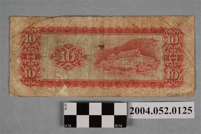 本物件為1969年臺灣銀行委託中央印製廠印製的新臺幣拾圓鈔券。以紅色為主墨色,採橫式印製,正背兩面皆凹版。鈔票正面由幾何花紋構成鈔票圖案的方框,方框四個角落各正寫「拾」字。方框內部上側左、右兩邊各印有編號Q002475A紅字,中間由右至左書寫「中華民國」等4字。正中央繪製略呈橢圓形狀的紅色幾何花框底圖,底圖中央由上而下覆寫「拾圓」二字,中央幾何花框兩側各繪製1個略呈橢圓形框的白色幾何花框。方框內最左側繪製孫文肖像。' 方框內下方中央由右至左書寫「臺灣銀行」等4字,方框內下方右側為臺灣銀行董事長戳章,左側為臺灣銀行總經理戳章。方框邊界外下方中央由右而左書寫「中央印製廠」等5字。背面印製波浪型幾何花紋方框,方框四角各正寫1個「10」數字,方框內右側繪製中山樓圖案,左側以紅色略呈扁橢圓形幾何花紋為底圖,底圖上覆寫「10」數字,方框外中央下方由右而左書寫「中華民國五十八年製版」等10字。
