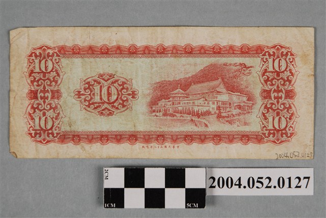 本物件為1969年臺灣銀行委託中央印製廠印製的新臺幣拾圓鈔券。以紅色為主墨色,採橫式印製,正背兩面皆凹版。鈔票正面由幾何花紋構成鈔票圖案的方框,方框四個角落各正寫「拾」字。方框內部上側左、右兩邊各印有編號S760390U紅字,中間由右至左書寫「中華民國」等4字。正中央繪製略呈橢圓形狀的紅色幾何花框底圖,底圖中央由上而下覆寫「拾圓」二字,中央幾何花框兩側各繪製1個略呈橢圓形框的白色幾何花框。方框內最左側繪製孫文肖像。方框內下方中央由右至左書寫「臺灣銀行」等4字,方框內下方右側為臺灣銀行董事長戳章,左側為臺灣銀行總經理戳章。方框邊界外下方中央由右而左書寫「中央印製廠」等5字。背面印製波浪型幾何花紋方框,方框四角各正寫1個「10」數字,方框內右側繪製中山樓圖案,左側以紅色略呈扁橢圓形幾何花紋為底圖,底圖上覆寫「10」數字,方框外中央下方由右而左書寫「中華民國五十八年製版」等10字。