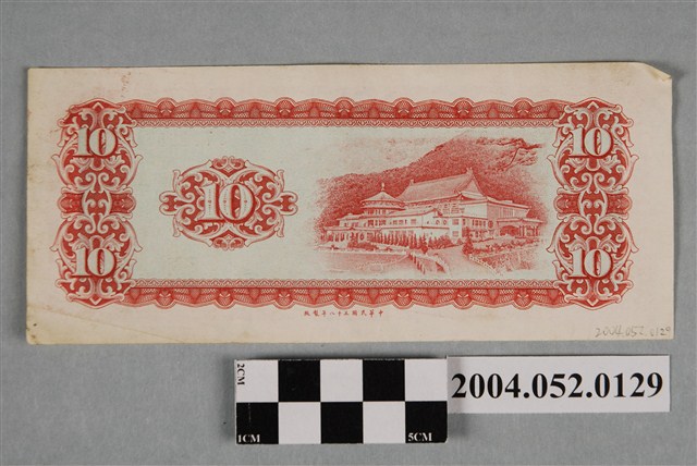本物件為1969年臺灣銀行委託中央印製廠印製的新臺幣拾圓鈔券。以紅色為主墨色,採橫式印製,正背兩面皆凹版。鈔票正面由幾何花紋構成鈔票圖案的方框,方框四個角落各正寫「拾」字。方框內部上側左、右兩邊各印有編號S772287U紅字,中間由右至左書寫「中華民國」等4字。正中央繪製略呈橢圓形狀的紅色幾何花框底圖,底圖中央由上而下覆寫「拾圓」二字,中央幾何花框兩側各繪製1個略呈橢圓形框的白色幾何花框。方框內最左側繪製孫文肖像。方框內下方中央由右至左書寫「臺灣銀行」等4字,方框內下方右側為臺灣銀行董事長戳章,左側為臺灣銀行總經理戳章。方框邊界外下方中央由右而左書寫「中央印製廠」等5字。背面印製波浪型幾何花紋方框,方框四角各正寫1個「10」數字,方框內右側繪製中山樓圖案,左側以紅色略呈扁橢圓形幾何花紋為底圖,底圖上覆寫「10」數字,方框外中央下方由右而左書寫「中華民國五十八年製版」等10字。
