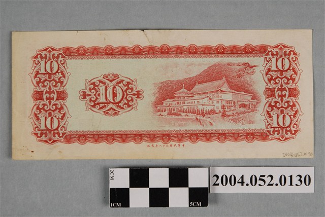1.本物件為1969年臺灣銀行委託中央印製廠印製的臺幣拾圓鈔券。以紅色為主墨色,採橫式印製,正背兩面皆凹版。鈔票正面由幾何花紋構成鈔票圖案的方框,方框四個角落各正寫「拾」字。方框內部上側左、右兩邊各印有編號X441266D紅字,中間由右至左書寫「中華民國」等4字。正中央繪製略呈橢圓形狀的紅色幾何花框底圖,底圖中央由上而下覆寫「拾圓」二字,中央幾何花框兩側各繪製1個略呈橢圓形框的白色幾何花框。方框內最左側繪製孫文肖像。方框內下方中央由右至左書寫「臺灣銀行」等4字,方框內下方右側為臺灣銀行董事長戳章,左側為臺灣銀行總經理戳章。方框邊界外下方中央由右而左書寫「中央印製廠」等5字。背面印製波浪型幾何花紋方框,方框四角各正寫1個「10」數字,方框內右側繪製中山樓圖案,左側以紅色略呈扁橢圓形幾何花紋為底圖,底圖上覆寫「10」數字,方框外中央下方由右而左書寫「中華民國五十八年製版」等10字。