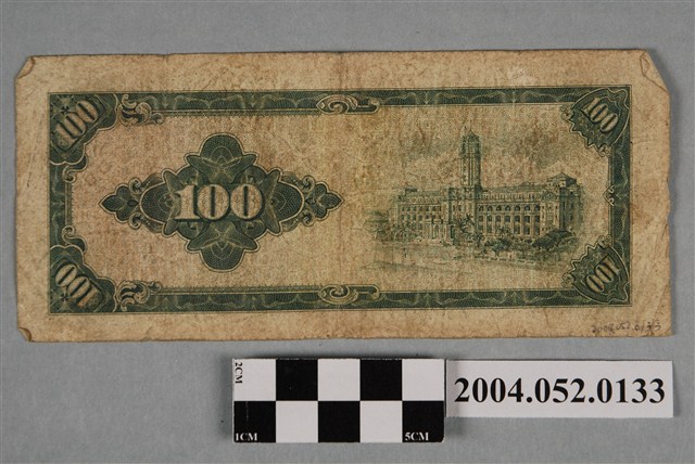 1.本物件為1964年臺灣銀行委託中央印製廠印製的臺幣壹佰圓鈔券。以綠色為主墨色,採橫式印製,正背雙面皆凹版。鈔票正面由幾何花紋構成鈔票圖案的方框,方框右上、左上兩角各繪幾何圖紋圓框,圓框內由上而下正寫「壹佰」兩字;右下、左下兩角則繪曲線六邊形框,框內由上而下亦正寫「壹佰」兩字。方框中央偏右側繪有波浪線條扁菱形綠色底紋圖案,圖案內由右而左覆寫「壹佰圓」3字,圖案外圍繞波浪線條紫色底紋圖案。圖案正上方靠邊框處由右而左書寫「臺灣銀行」等4字。圖案上方左、右兩邊各印有編號A333603S紅字。 圖案下方右側為臺灣銀行董事長戳章,左側為臺灣銀行總經理戳章。方框內最左側繪製孫文肖像。下方框圖案中央偏右處另覆繪一方框,方框內由右而左書寫「中華民國五十三年」等8字。方框邊界外下方中央偏右空白處由右而左書寫「中央印製廠」等5字。背面亦印製幾何花紋方框,方框四角各斜寫1個「100」數字,方框內右側繪製總統府圖案,左側以綠色略呈扁菱形幾何花紋為底圖,底圖上覆寫「100」數字。2.1961年,臺灣銀行開始發行第一套橫式新臺幣鈔票,面額分為伍圓、拾圓、伍拾圓、壹佰圓等共4種,本物件壹佰圓鈔票為1964年印製,1965年9月8日發行。本版鈔票於1981年12月8日停用。