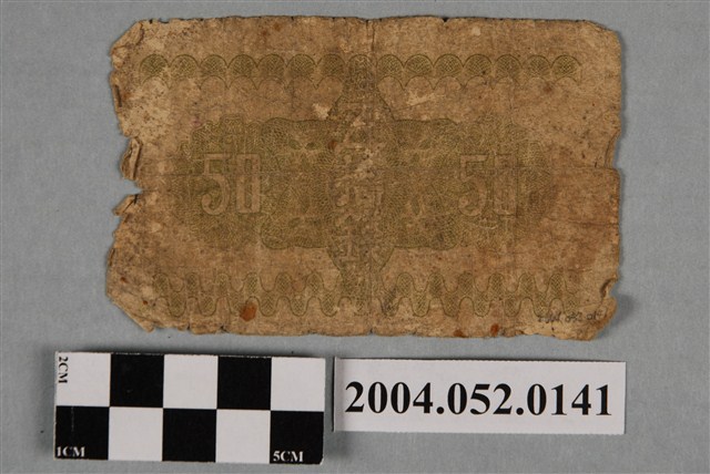1.本物件為1938年日本內閣印刷局發行的日幣伍拾錢紙幣。以灰色為主墨色,採橫式印製,長6.5公分,寬10.5公分。鈔票正面由兩條邊線圍成鈔票圖案的方框,方框內右上側繪陽光圖左側繪富士山及雲海圖,左下角及下側偏右處繪富士櫻圖。方框右上角繪製網紋底圖花框,框內正寫「50」數字,左上角繪製網狀底紋曲線方框,框內由右而左正寫「五拾」兩字。正中央上方框線內繪有菊花紋徽,紋徽右側以篆體由右而左書寫「大日本帝國」;左側以篆體書寫「政府紙幣」等4字。方框右側靠近邊線處自上而下書寫「紀元二千五百九十八年」等10字,左側靠近邊線處自上而下書寫「昭和十三年」等5字,下方中央靠近邊線處繪製深色底方框,框內由右而左覆寫「內閣印刷局製造」等7字。方框內左上、右下處各以紅字書寫「{1624}」編號,左下有大藏大臣(相當於財政部長)圓形職稱戳印。紙幣背面以綠色為主色,上側繪製15個橫向相連的下弦月形網紋圖案,下側繪製橫向波浪線條網紋圖案。正中央繪製網底紋星形圖案,圖案內由上而下書寫「五拾錢」3字。中間左、右兩側各繪製1個12瓣的花形網紋底圖案,圖案內正寫「50」數字。2.1937年日中戰爭爆發,為解決戰爭時期金屬不足問題,日本政府停止發行面額50錢的硬幣,並於次年(1938)開始發行50錢面額紙幣。由於日本以傳說中第一代神武天皇即位的西元前660年為皇紀元年,因此鈔票上也印上紀元2598年的字樣。本物件為1938年7月日本內閣大藏省所發行的第1版50錢紙幣,大藏省相當於我國的財政部。終戰後紙幣全面回收,1948年8月停止流通使用。