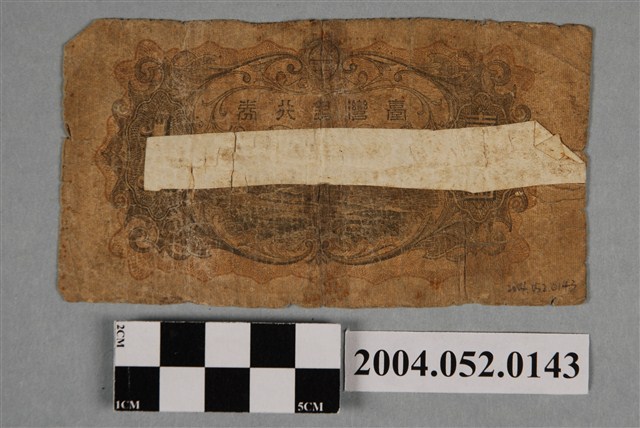 1.本物件為1933年臺灣銀行發行的壹圓鈔券。採橫式印製,長6.7公分,寬12.8公分。鈔票正面以黑色為主墨色,由幾何花紋圍成鈔票圖案的方框。方框右上、左上兩角繪製網紋底圖星形框,框內斜寫「壹」字;右下、左下兩角繪製網紋底圖菇形框,框內斜寫「1」數字。框內正中央上方由右而左略帶環狀書寫「臺灣銀行券」等5字。正中央繪製橘色底圖橢圓框,框上自上而下覆寫「壹圓」兩字,橢圓框右邊書寫「此券引換に金拾圓相渡可申候也」等日文字,左上邊自上而下再由右而左書寫「株式會社」4字,「株式會社」4字下方自上而下書寫「臺灣銀行」4字,「臺灣銀行」4字下方有臺灣銀行頭取(按:總經理)圓形戳印。框內右側繪製幾何網紋底橢圓框,橢圓框內正寫「1」數字。框內左側繪製臺灣神社圖。框內右上、左下兩區書寫「{61}」組號,左上、右下兩側書寫「089274」編號。方框下方中央編上由右而左覆寫「大日本帝國政府內閣印刷局製造」等14字。鈔券背面以橘色幾何圖形為底圖,綠色為主色。中央繪製略帶扁橢圓框,上方框線正中央繪有臺灣銀行行徽。扁橢框內上側由右而左書寫「臺灣銀行券」等5字,框內下側繪製鵝鑾鼻燈塔圖案。扁橢圓形框兩側各繪製1個正橢圓網紋底圖框,其中右邊網紋底圖框內自下而下覆寫「壹圓」兩字,左邊網紋底圖框內覆寫「1」數字。2.日治時期臺灣總督府於1899年設立的臺灣銀行,是臺灣第一家具有現代營業形式的銀行,並被賦予發行貨幣的任務。除了二戰末期外,臺灣銀行發行的鈔券,皆委由日本內閣印刷局印刷,再運來臺灣。本物件壹圓臺灣銀行券,是1933年7月臺灣銀行發行的鈔券,本鈔券與1932至1937年發行的拾圓、五圓、百圓等面額鈔券,被稱為昭和甲券。鈔券至1946年以後停止流通。