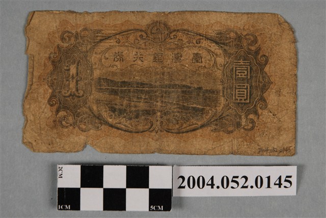 1.本物件為1933年臺灣銀行發行的壹圓鈔券。採橫式印製,長6.7公分,寬12.8公分。鈔票正面以黑色為主墨色,由幾何花紋圍成鈔票圖案的方框。方框右上、左上兩角繪製網紋底圖星形框,框內斜寫「壹」字;右下、左下兩角繪製網紋底圖菇形框,框內斜寫「1」數字。框內正中央上方由右而左略帶環狀書寫「臺灣銀行券」等5字。正中央繪製橘色底圖橢圓框,框上自上而下覆寫「壹圓」兩字,橢圓框右邊書寫「此券引換に金拾圓相渡可申候也」等日文字,左上邊自上而下再由右而左書寫「株式會社」4字,「株式會社」4字下方自上而下書寫「臺灣銀行」4字,「臺灣銀行」4字下方有臺灣銀行頭取(按:總經理)圓形戳印。框內右側繪製幾何網紋底橢圓框,橢圓框內正寫「1」數字。框內左側繪製臺灣神社圖。框內右上、左下兩區書寫「{68}」組號,左上、右下兩側書寫「221455」編號。方框下方中央編上由右而左覆寫「大日本帝國政府內閣印刷局製造」等14字。鈔券背面以橘色幾何圖形為底圖,綠色為主色。中央繪製略帶扁橢圓框,上方框線正中央繪有臺灣銀行行徽。扁橢框內上側由右而左書寫「臺灣銀行券」等5字,框內下側繪製鵝鑾鼻燈塔圖案。扁橢圓形框兩側各繪製1個正橢圓網紋底圖框,其中右邊網紋底圖框內自下而下覆寫「壹圓」兩字,左邊網紋底圖框內覆寫「1」數字。2.日治時期臺灣總督府於1899年設立的臺灣銀行,是臺灣第一家具有現代營業形式的銀行,並被賦予發行貨幣的任務。除了二戰末期外,臺灣銀行發行的鈔券,皆委由日本內閣印刷局印刷,再運來臺灣。本物件壹圓臺灣銀行券,是1933年7月臺灣銀行發行的鈔券,本鈔券與1932至1937年發行的拾圓、五圓、百圓等面額鈔券,被稱為昭和甲券。鈔券至1946年以後停止流通。