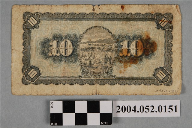 1.本物件為1946年臺灣銀行委託中央印製廠印製的臺幣拾圓鈔券。以灰色為主墨色,採橫式印製,長7.6公分,寬14.2公分。鈔券正面是由幾何花紋構成鈔票圖案的方框,方框四角各以楷書斜寫「拾」字。方框內右方以幾何花紋、「拾圓」文字為底紋,底紋上繪製臺灣地圖,臺灣地圖上方由右而左書寫「台幣」兩字,臺灣地圖圖案由上而下覆蓋「拾圓」兩字。左方則繪製臺灣銀行總行建築,圖案上方有紅色「BK954773」編號。中央繪製孫文肖像,肖像上方由右至左書寫「台灣銀行」等4字,肖像下方由右至左書寫「中華民國三十五年印」等9字,肖像右下方為臺灣銀行董事長戳章,左下方為臺灣銀行總經理戳章。方框邊界外下方中央由右而左書寫「中央印製廠」等5字。背面印製波浪型幾何花紋方框,方框四角各斜寫「拾」字,中央印製點狀直式橢圓形框,橢圓框內印鄭成功與荷蘭的海戰圖。橢圓框兩側各繪製略呈90度三角形幾何花紋底圖,底圖上覆寫「10」數字。2.戰後初期臺灣省行政長官公署成立後,原暫時讓日治時期發行的臺灣銀行券流通,1946年6月,國民政府才正式授權臺灣銀行發行鈔券,並在5月22日委託中央印製廠上海廠印製壹圓、伍圓、拾圓等3種面額鈔券,再分批運來臺灣。由於1949年臺灣省政府實行幣制改革,發行新臺幣,前此發行的貨幣於1950年1月14日正式停止流通。相較於新臺幣,幣制改革前發行的貨幣則慣稱為舊臺幣。