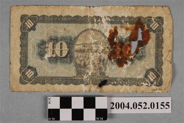 1.本物件為1946年臺灣銀行委託中央印製廠印製的臺幣拾圓鈔券。以灰色為主墨色,採橫式印製,長7.6公分,寬14.2公分。鈔券正面是由幾何花紋構成鈔票圖案的方框,方框四角各以楷書斜寫「拾」字。方框內右方以幾何花紋、「拾圓」文字為底紋,底紋上繪製臺灣地圖,臺灣地圖上方由右而左書寫「台幣」兩字,臺灣地圖圖案由上而下覆蓋「拾圓」兩字。左方則繪製臺灣銀行總行建築,圖案上方有紅色流水編號,但因鈔券部分損毀,僅能辨識末5碼為「50863」。中央繪製孫文肖像,肖像上方由右至左書寫「台灣銀行」等4字,肖像下方由右至左書寫「中華民國三十五年印」等9字,肖像右下方為臺灣銀行董事長戳章,左下方為臺灣銀行總經理戳章。方框邊界外下方中央由右而左書寫「中央印製廠」等5字。背面印製波浪型幾何花紋方框,方框四角各斜寫「拾」字,中央印製點狀直式橢圓形框,橢圓框內印鄭成功與荷蘭的海戰圖。橢圓框兩側各繪製略呈90度三角形幾何花紋底圖,底圖上覆寫「10」數字。2.戰後初期臺灣省行政長官公署成立後,原暫時讓日治時期發行的臺灣銀行券流通,1946年6月,國民政府才正式授權臺灣銀行發行鈔券,並在5月22日委託中央印製廠上海廠印製壹圓、伍圓、拾圓等3種面額鈔券,再分批運來臺灣。由於1949年臺灣省政府實行幣制改革,發行新臺幣,前此發行的貨幣於1950年1月14日正式停止流通。相較於新臺幣,幣制改革前發行的貨幣則慣稱為舊臺幣。