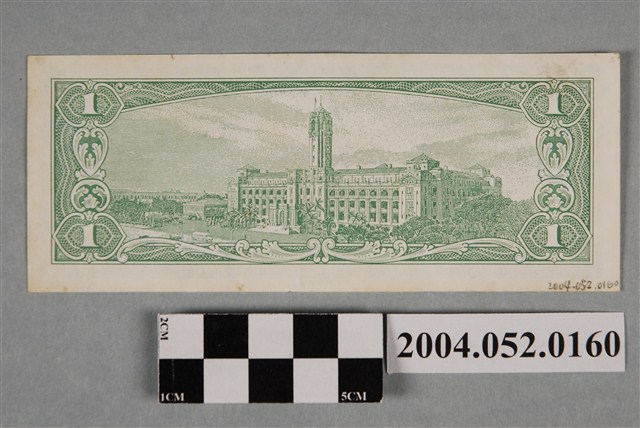 1.本物件為1961年臺灣銀行印製的新臺幣壹圓鈔券。以墨綠色為主墨色,採橫式印製,長5.55公分,寬13.75公分,正面為凹版印刷,背面為平版印刷。鈔券正面是由幾何花紋構成鈔票圖案的方框,方框四角各以楷書正寫「壹」字。方框內右方繪製花蓮蘇花公路清水斷崖象鼻隧道圖案。左方繪製直立橢圓框,框內繪製孫文肖像。左、右兩圖案上方各有1組「A844987V」之紅色流水編號。正中央繪製曲線條扁橢圓形紫色幾何紋路底圖,圖上由右而左覆寫「壹圓」兩字。扁橢圓底圖上方由右至左書寫「臺灣銀行」等4字,下方由右至左書寫「中華民國五十年」等7字,底圖右下方為臺灣銀行董事長戳章,左下方為臺灣銀行總經理戳章。方框邊界外下方中央由右而左書寫「臺灣銀行印刷所」等7字。鈔券背面亦印製幾何花紋方框,方框四角各正寫「1」數字,方框內繪製總統府圖案。2.1949年新臺幣發行初期,發行的鈔券均為直式印製,1961年,臺灣銀行開始發行第一批橫式鈔券,該年度製作的鈔券共有壹圓、伍圓、拾圓、伍拾圓等4種面額。本物件壹圓鈔券,即是1961年5月1日所發行最早的橫式新臺幣鈔券,也是該年度製作的鈔券中,唯一由臺灣銀行印刷所掛名的鈔券。負責印製鈔券的臺灣銀行印刷所,前身是設於總統府建築內的第一印刷廠,1954年印刷廠遷至萬華大理街,改稱臺灣銀行印刷所。1961年,中央銀行復業,9月,接收臺灣銀行印刷所,改為中央印製廠萬華廠。本版鈔券於1981年12月8日停止流通。