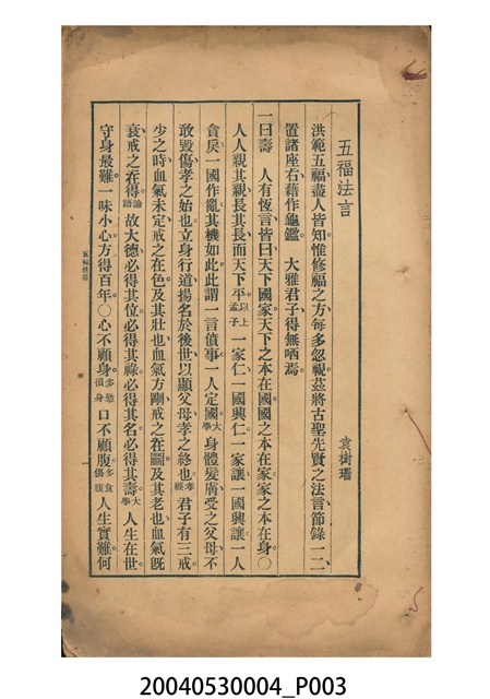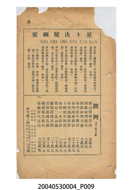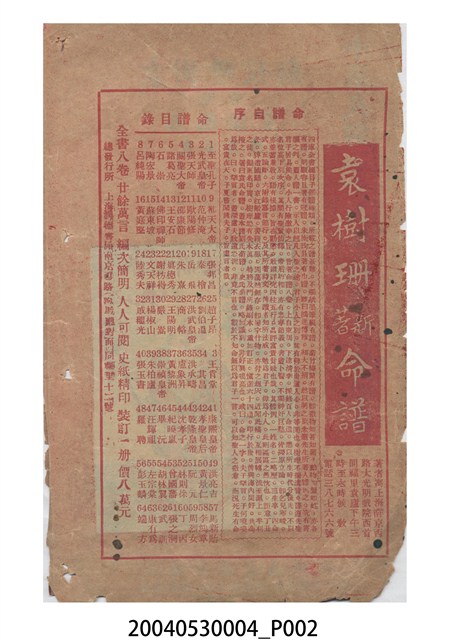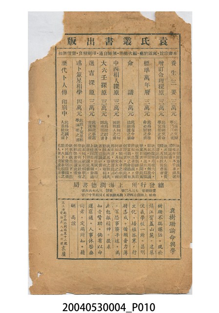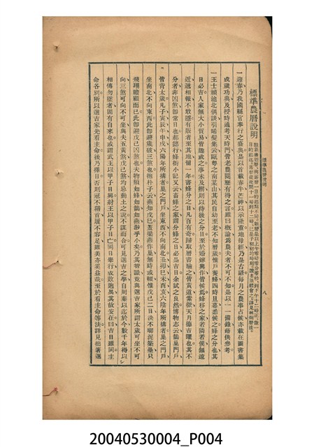 1.本件為「袁樹珊校勘民國三十七年歲次庚子《標準農曆通書》」,右翻四孔線裝,穿孔處破損嚴重,紅線脫落,書皮紅底黑字,四邊皆磨損與破損,部分有退色。2.封面以南極仙翁為主要構圖至於下方,最底部有「上海潤德書局印行」,本書附載五福法言,農事占候。封底脫落。