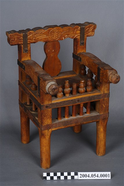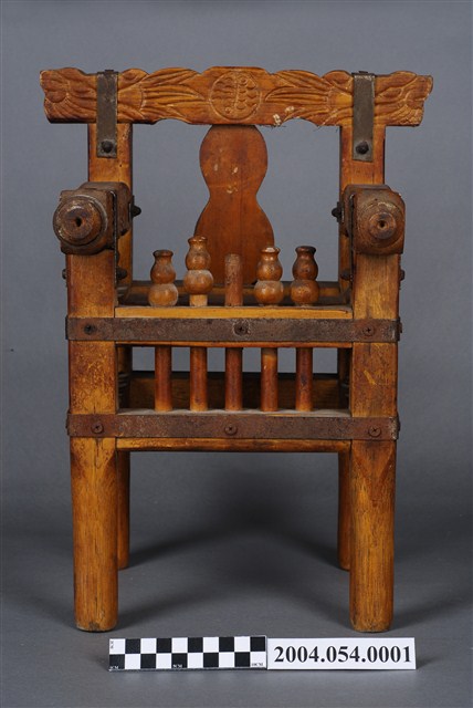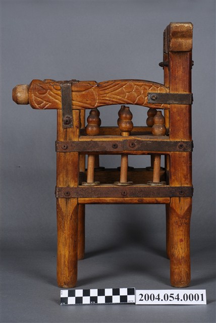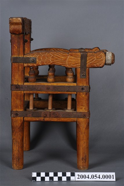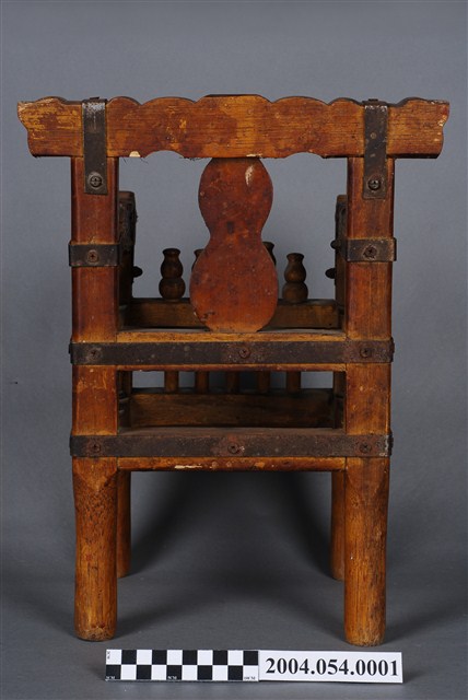 本件手轎採傳統四腿、雙扶手、靠背左右出頭的四出頭官帽椅造形,通身僅在靠背及扶手前端有簡單的雕飾。手轎之橫向、縱向與垂直向的構件之間接以傳統的插榫接合,又在轎身、扶手前端與靠背橫豎木條交接觸環繞金屬桁條,以強化其結構之穩定。前方作五根攔木穿過上下兩橫條,中央一根上端留有插香之孔洞,其他四根頂端作葫蘆造形。兩側扶手刻龍頭紋,前端留有孔洞以供插香,背板作單片葫蘆形,並在左右兩側作三根攔木穿過上下兩橫條,頂端作葫蘆形。