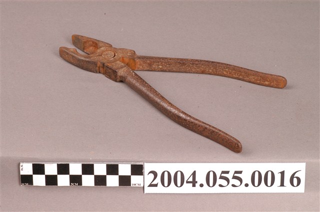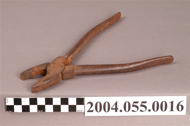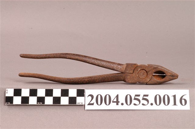 本文物為老虎鉗、鐵絲鉗,鉗頭以二鐵條或鐵片夾住物品兩側,二鐵條交叉處以活動鈕接合,鈕後鐵條為握把。老虎鉗綜合抓取與剪斷功能,鉗頭為厚實鐵片,二鐵條前端閉合為面狀,抓取力道較強。鉗頭中間做刀片以剪斷鐵絲、銅線。運用範圍廣,現代營造業、家庭維修常用於抓取、彎折、剪斷鐵絲、銅線等,戰後至今仍是相當普遍的工具。