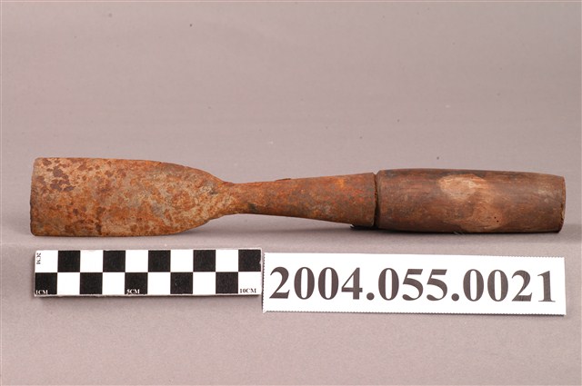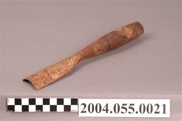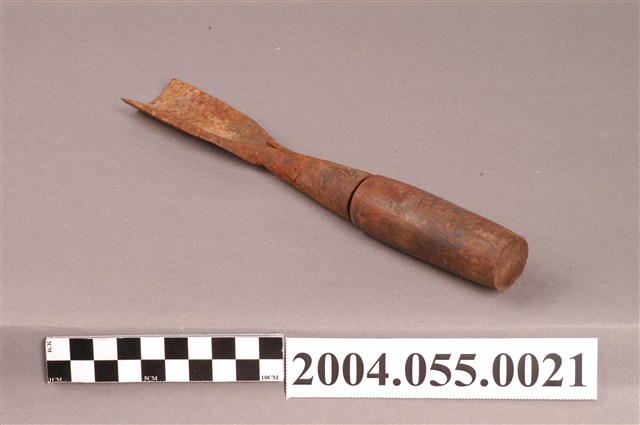 為木工工具,為鑿刀,又稱鑿仔。在建築匠師的工別上,大木、鑿花都會用到鑿刀,家具匠師也會使用。通常與鎚配合作業。鑿刀通常由刀片、刀柄、鐵環三種構件組成。若不必搭配鎚的細部作業,則鑿刀不必在刀柄尾端加鐵環。可依刀口形狀不同,分為圓口與平口兩類,本件為圓口鑿刀。刀片為鐵,刀刃材質為鋼,刀柄木製,鐵環用以固定刀柄端。鑿刀用以削木、鑿洞、作榫等作業。木作匠師常購買刀刃,再自行製作刀柄製成鑿刀。近期工具店亦販賣成品。鑿刀的尺寸以刃口長度做區別,本件刃口長度3.6cm,為1寸2分鑿刀。
