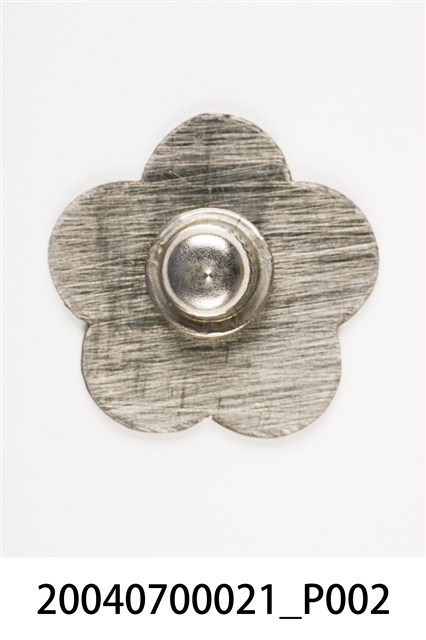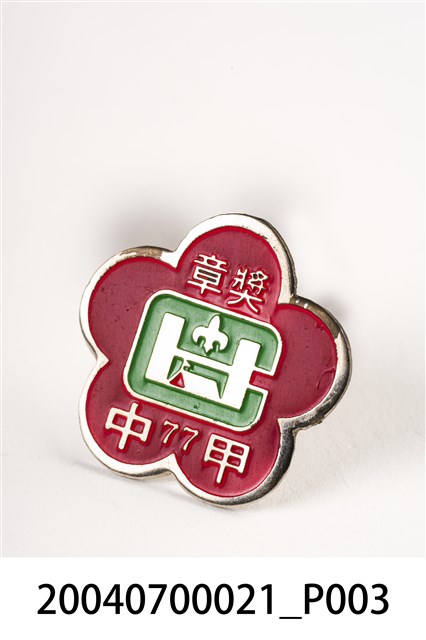 本件為童子軍獎章,金屬材質,梅花外型,製作時間不詳,正面印有「甲中」、「77」字樣,以及童子軍百合花外型及帳棚圖樣,背面附有章扣。推測可能為臺南市後甲國民中學童軍團所頒發之物品。