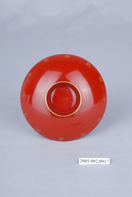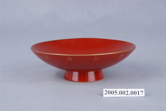 上海派遣軍司令部凱旋紀念朱漆清酒杯,圓形,口外闊,器身圓弧略有深度,似碗狀,底部中央接有高腳圈足,足底略外張。木胎,全器髹朱漆,口沿及足底邊緣塗一圈金漆,酒杯外側近緣口處環繞一圈橫式「上海派遣軍司令部凱旋紀念」字樣,內側正中央以金漆繪製五芒星圖樣。