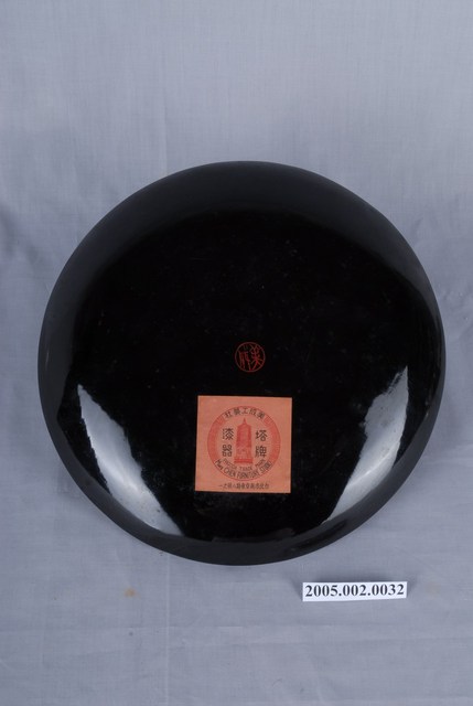 1.本物件為美成工藝社塔牌漆器水果盤,盤體以黑色為基底,盤底繪有兩圈以水果圍成的圓圈,但並無法判斷為何種水果。盤底背面有塔牌漆器的商標,由美成工藝社出品,並標出其地址位於臺北市南京東路8號之1。
