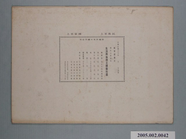 1.本物件為不做壞事不說壞話生活與倫理立體教科圖,正面底色為白色,同時有紅色與黃色相間之外框,圖框內部由上而下寫有「教育部審定」、「國民小學適用」、「生活與倫理立體教科圖」、「不做壞事不說壞話」,此應為生活與倫理課程中國小二年級之教材,此教科圖內容為藉由腳與手等四肢的擬人對話,彼此抱怨工作繁重,最後得出只要努力勤勞工作,不做壞事、不說壞話。背面為出版資訊,同時寫有「民族至上」、「國家至上」之字樣。