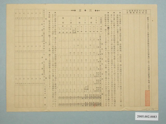 此件為保險院簡易保險局所發出的保險證書,內容為二百八十五圓的十五年滿期小兒保險,滿期時間為1957年6月18日,被保險人邱贊坤,要保人邱從德,受益人邱贊坤。背面則為異動欄、注意事項及貸付欄等欄位。
