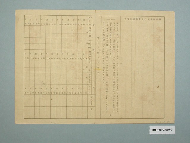 本件為昭和20年(1945)2月16日,邱鎮坤投保通信院貯金保險局之郵便年金證書。其種類為12歲開始支付,4年期之定期年金;開始支付日為昭和22年(1947)1月18日,支付日期為4月18日、7月18日、10月18日、1月18日,掛金總額為651圓4錢。