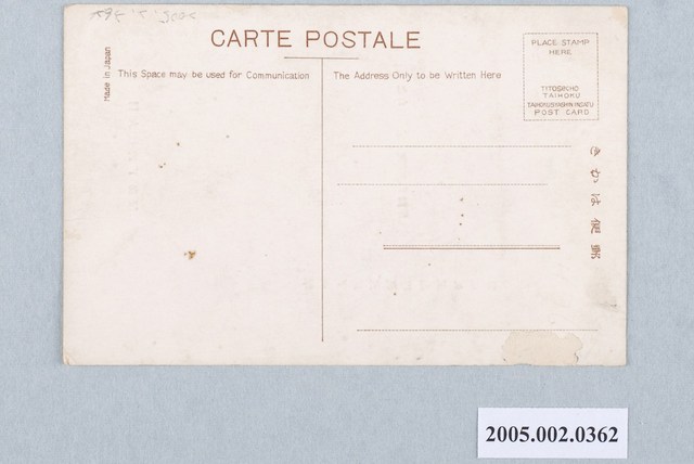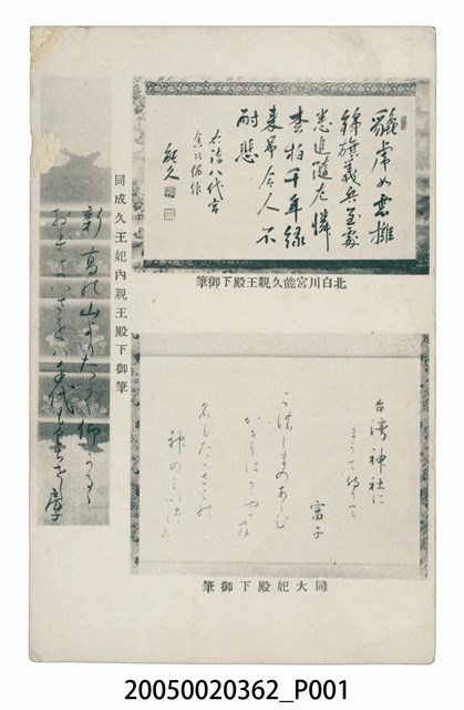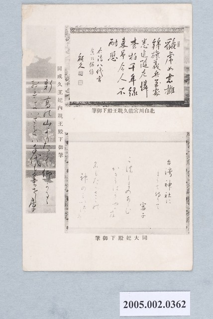 1.本物件以皇民化運動為主題,黑白樣式。正面為三人御筆之圖像,右上方圖像為北白川宮能久親王殿下御筆、右下方為同大妃殿下御筆、左方圖像為同成久王妃內親王殿下御筆。右上方圖像可見能久親王之落款,右下方圖像可見其提到臺灣神社。背面右上角為郵票黏貼處,該處以英文字母書寫「PLACE STAMP HERE」、「TITOSECHO TAIHOKU TAIHOKUSYASHIN INSATU POST CARD」,右側有以漢字、平假名書寫之「郵便はがき」,上方以英文字母書寫「CARTE POSTALE」、「This Space may be used for Communication」、「The Address Only to be Written Here」。左上方以英文標示「Made In Japan」。2.正廳改善運動乃日治時期為推動皇民化的項目之一,使臺民加強對於日本帝國的認同感。正廳改善運動主要是藉由信仰的方式去漢化,推動家家戶戶供奉神宮大麻的神龕,取代傳統臺灣神佛與祖先的地位。