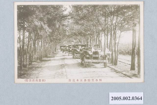 1.本物件以恆春為主題,黑白樣式。正面為恆春鵝鑾鼻一處道路之圖像,道路兩旁有連排的樹木,且現代汽車正在行駛於道路上,第一臺汽車上印有「XI-492」的車牌號碼。明信片下方以漢字書寫「恆春鳶鑾鼻並木道路」,左下方以漢字標示「佐藤商店發行」。背面右上角為郵票黏貼處,右側有以漢字、平假名書寫之「郵便はがき」,上方以英文字母書寫「POST CARD」。2.鵝鑾鼻乃西元1927年(昭和2年)時,臺灣日日新報透過舉辦票選活動,促進民眾參與,所選出的「臺灣八景」之一。