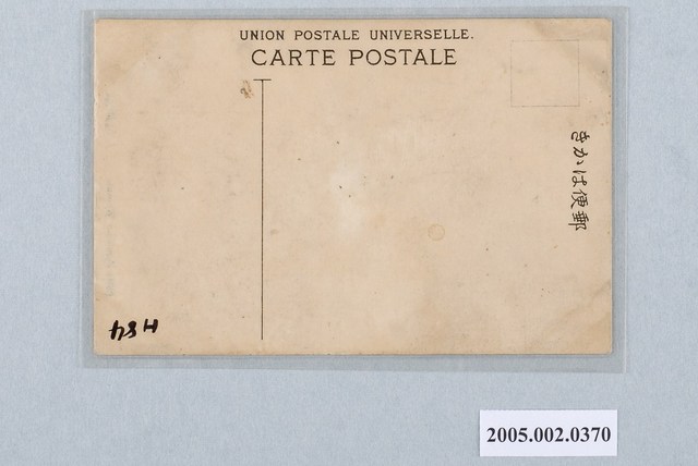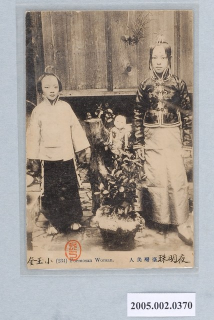 本物件以臺灣美人為主題,黑白樣式。正面為兩位女童身穿華麗中式古裝之圖像。右方女童身高較高,身著深色長袖上衣、淺色長袍,頭上有髮簪。左方短髮女童身著淺色長袖上衣、深色長袍。下方以漢字書寫「臺灣美人」、以英文字母書寫「Formosa Women」。上頭有人為書寫痕跡「夜明珠」、「小玉奎」。背面右上角為郵票黏貼處,右側有以漢字、平假名書寫之「郵便はがき」,上方以英文字母書寫「CARTE POSTALE」、「UNION POSTALE. UNIVERSELLE」。