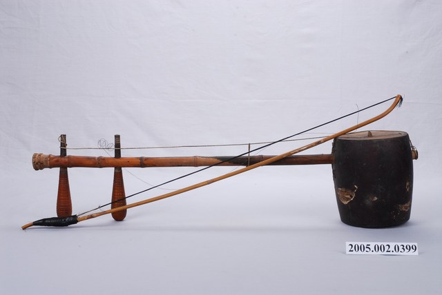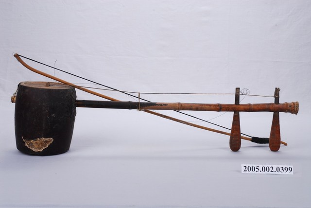 1.本件大廣弦的琴筒筒身為黑色,有一處明顯破損,琴桿為竹製,近琴筒處塗黑色,另一半呈現竹子原色,琴弓為藤製,有兩根調弦弦紐,外觀老舊,筒身有一處明顯破損。2.大廣弦琴筒部份較其他的擦弦樂器為大,常見於南管以外之民間戲劇與陣頭之中。