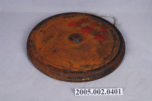 1. 本件為銅製鑼,鑼面為中間有突出鑼心的形式,本件有明顯銹斑以及磨痕,頂部穿繩作為提拿使用,本物件鑼面上有「樹仔腳錦樂軒」字樣。。