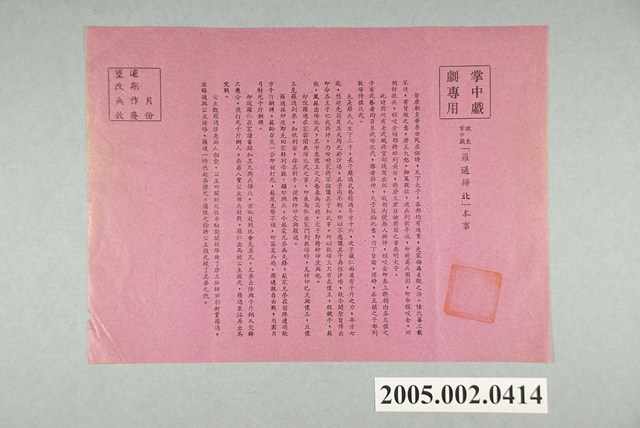 1.《羅通掃北》掌中戲本事,為亮粉色紙張,黑色字體,右下有蓋紅色官印,推測是供各地警察局現場查驗使用。右側標題註明「掌中戲劇專用」及「改良掌中戲『羅通掃北』本事」;置中為劇情介紹;左側則列出「 月份,逾期作廢,塗改無效」等字樣。《羅通掃北》原是清代章回小說,在小說中,羅通是一位唐朝的名將,在唐太宗御駕親征卻中計受困之時,羅通率領大軍前往救援的故事。由於情節高潮迭起,經常被改編為戲曲及說唱藝術。